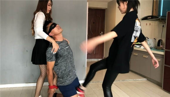 内容:本片由超暴力女神霏霏与长腿女孩乐乐倾情献映,剧情讲述的是霏霏抓获一名偷内衣的变态,之后打电话给闺蜜乐乐叫其一起来参与惩罚该变态的过程。值得一提的是:本片算是拍过的片子中,数一数二的暴力击打作品了,一度怀疑霏霏女主太过入戏,,不论是言语训斥还是踢裆动作,都特别特别的狠,一双黑网袜+小白运动鞋形成视觉反差,由于踢的过狠过快导致截图时候很虚化不太好截取,最后踢废色狼以后,霏霏女主还不解气,硬是要来一个单独的网袜脚深喉才过瘾。男M在拍完本片之后,休息了好久好久。。。。