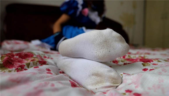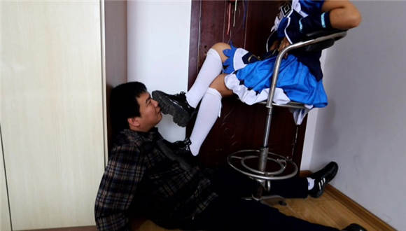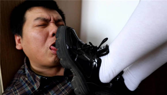 袜子不是配套的,蓝色条纹袜比较干净不太合适,就找了一双之前穿了很久的纯白色的,这双袜子脚底很黑巨臭无比,强迫闻袜子 脚插嘴深喉,舌头当脚垫一点一点的舔袜子。舔鞋底 鞋底也很脏 把鞋底的泥都舔干净