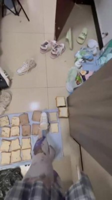 又是超可爱的桃子姐姐呀,今天要给狗狗制作狗粮了,只是几片面包狗狗肯定吃不饱吧?姐姐会用每一双鞋子加工食物哦,一共十几二十双鞋子吧?每一片面包都会印上狗狗喜欢的鞋印哦。贱狗还觉得不够?那让姐姐为你加点泥土,狗狗可要好好的都吃掉哦!