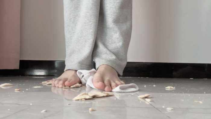 这双白棉袜可穿了好多天了,又脏又臭,穿着它狠狠的碾碎狗粮,再光脚把它和面包踩在一起,想必美味极了吧