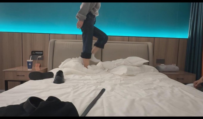 定制的双人踩枕头,两个女主穿着黑色的小皮鞋和运动鞋,皮鞋踩下去的时候会有种硬硬的压迫感,像是直接把重量压到一点上。运动鞋更厚实,但弹性更强,踩下去的瞬间也更沉重。一边踩一边调整角度,有时候站着不动直接把重量压着,有时候脚尖点着、旋转着踩。中间一段把鞋子脱掉,换成白袜踩。两个女主依次用白袜踩在枕头上,当两个人同时踩在上面的时候,那种缓慢下沉的感觉很明显。她们还会交换位置,时不时地把脚凑到一起踩同一个点,把整个枕头压得扁平,像是要把里面的空气都挤出来,喜欢看踩枕头的不要错过哦。